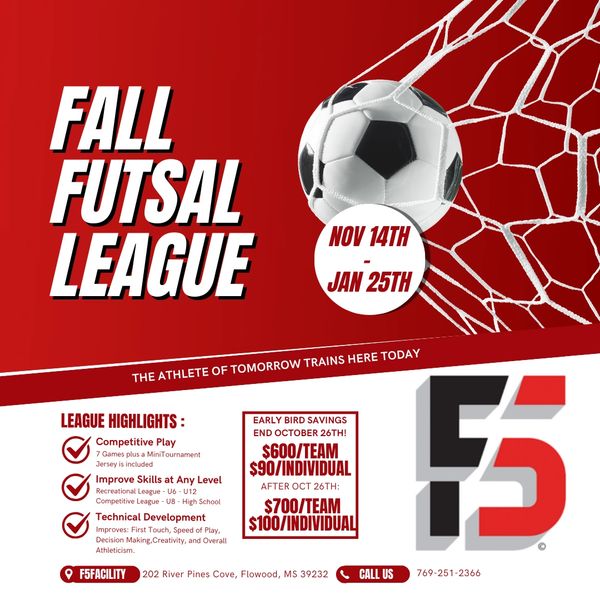 We believe there is a soccer player hidden in everyone, and Futsal is the best way to stay fit and bring out the competitor in you. We realized there are no actual futsal courts anywhere in central Mississippi for kids and decided to create an indoor community driven facility where all ages can enjoy futsal. F5 is a combined effort of professional soccer players who wanted to develop balance, motor ability, agility and co-ordination, ball mastery, accurate and quick passing and receiving perception insight, and awareness in children. As Futsal is fast and action-packed, fitness is improved while learning and having fun.
